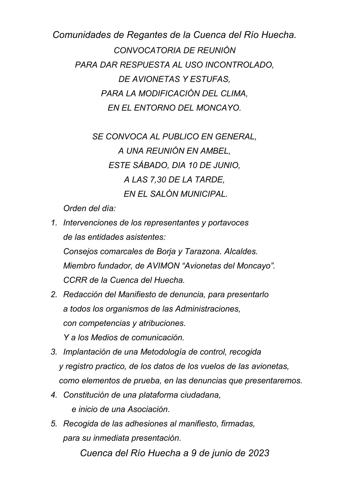 Remitimos CONVOCATORIA DE PRENSA de la reunión que mantendremos este sábado 10 de junio en Ambel (Zaragoza) ante nuestra preocupación por el uso incontrolado de avionetas y estufas para la manipulación del clima en el entorno del Moncayo, dada la situación de sequía que estamos viviendo.